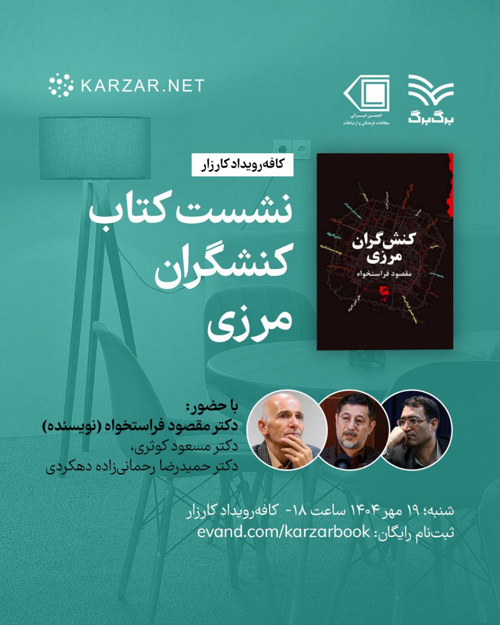 پلتفرم کارزار نشست ویژهای درباره کتاب مهم «کنشگران مرزی» برگزار میکند. در این رویداد، با نویسندهی این اثر دکتر #مقصود_فراستخواه، جامعهشناس ایرانی و استاد برنامهریزی توسعه آموزش عالی، دکتر #مسعود_کوثری پژوهشگر ایرانی حوزه ارتباطات، فرهنگ، موسیقی و توسعه و استادیار و مدیر گروه ارتباطات اجتماعی دانشگاه تهران و همچنین دکتر #حمیدرضا_رحمانی_زاده دهکردی، استاد علومسیاسی دانشگاه علامهطباطبایی و باقی دوستان و علاقهمندان همراه هستیم.